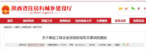 12月8日,陕西省住建厅发布了关于建设工程企业资质延续的通知,明确:资质有效期于2024年12月31日前届满的,统一延期至2024年12月31日。
